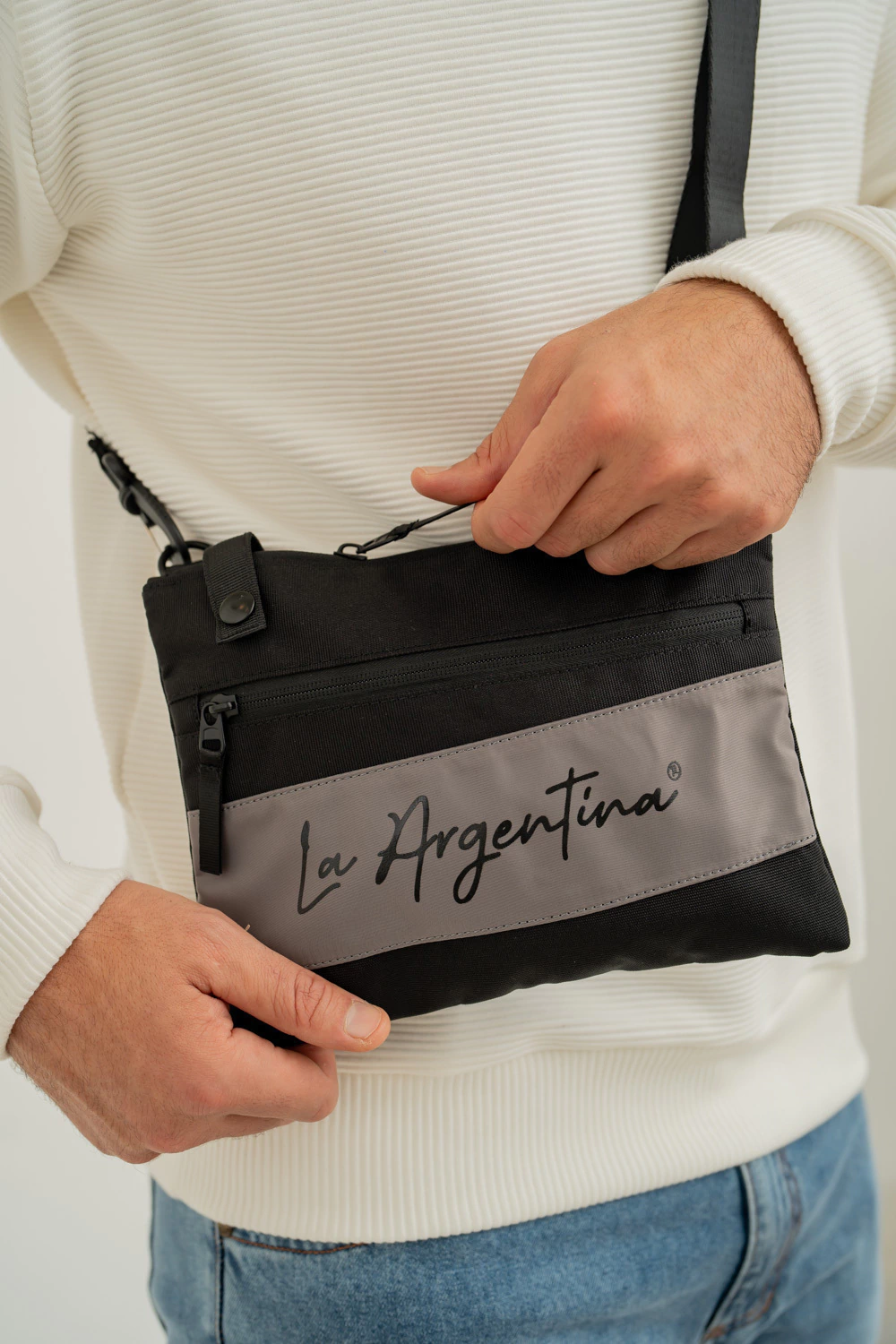 La Bandolera Recoleta es tu compañera ideal para el ritmo de la ciudad. Compacta pero espaciosa, está confeccionada en lona resistente y cuenta con un bolsillo frontal con cierre y estampa "La Argentina®", además de un compartimento principal con doble cierre para mayor seguridad. Su correa regulable permite adaptarla cómodamente a tu estilo