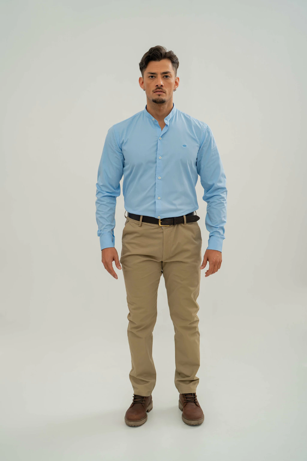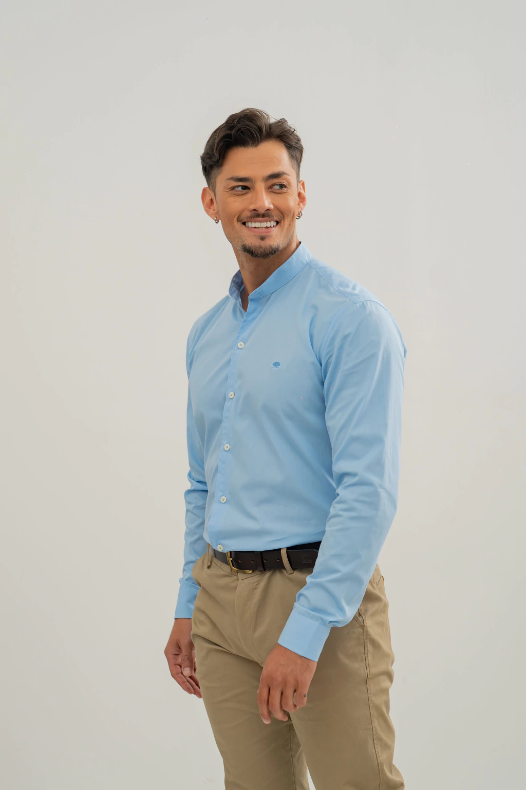 La camisa Cristobal es una prenda de mangas largas y cuello Mao con un calce entallado que realza la figura masculina. Los botones personalizados y el bordado en el pecho añaden un toque distintivo.