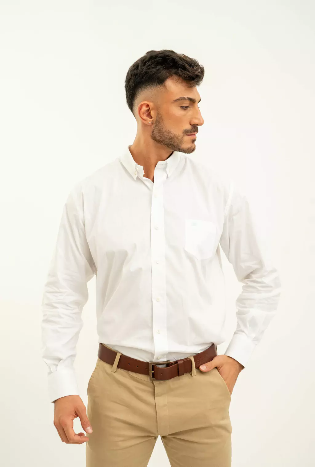 Confeccionada en popelín de alta calidad, esta camisa cuenta con botones personalizados y un bolsillo en el pecho con el logo bordado.