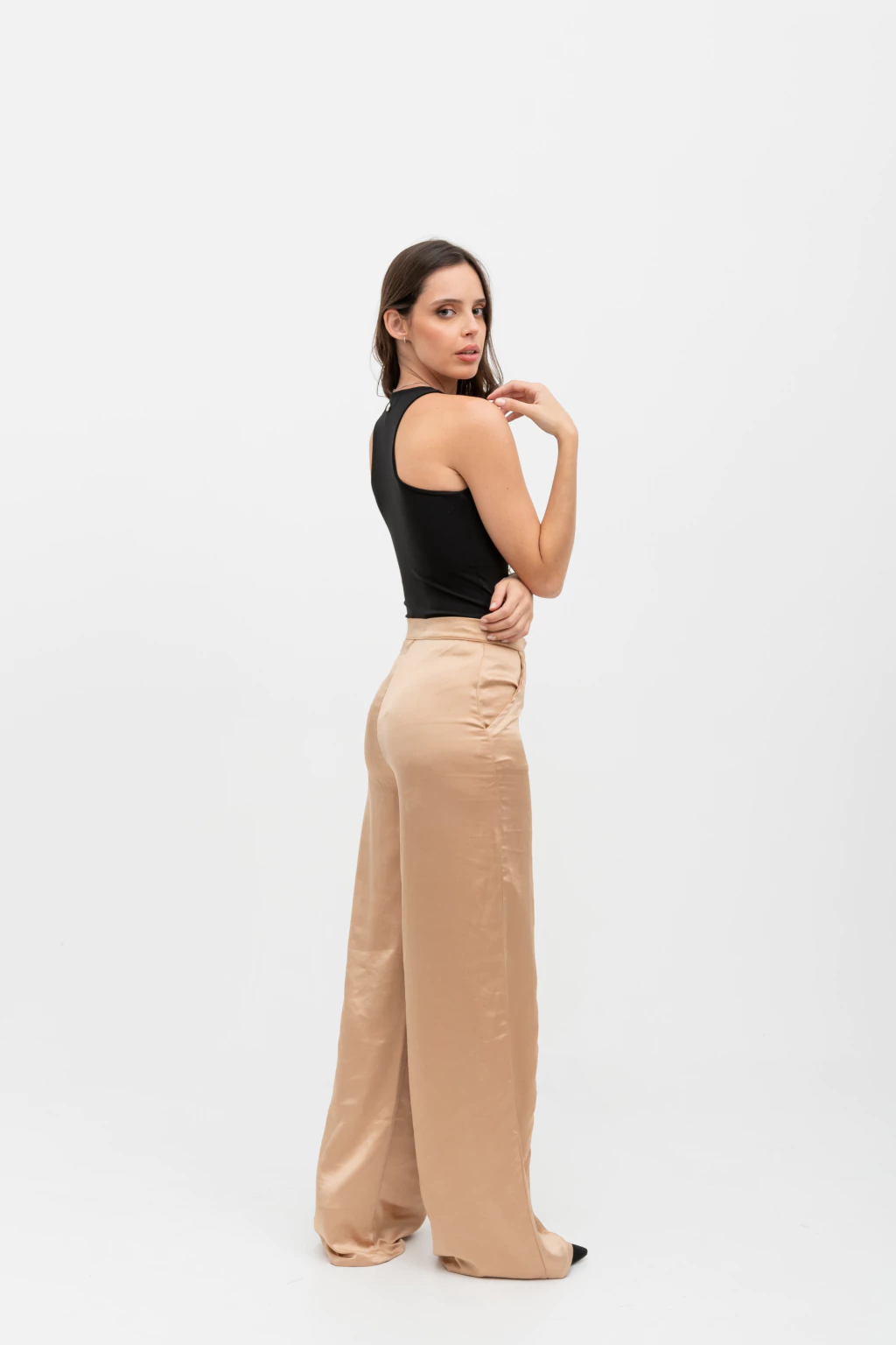 Este pantalón sastrero de corte recto y elegante es una prenda esencial de estilo. Destaca por su botón labrado y el aplique metálico de diseño exclusivo en la cintura. Un pantalón sofisticado, con una caída impecable, ideal para cualquier ocasión.