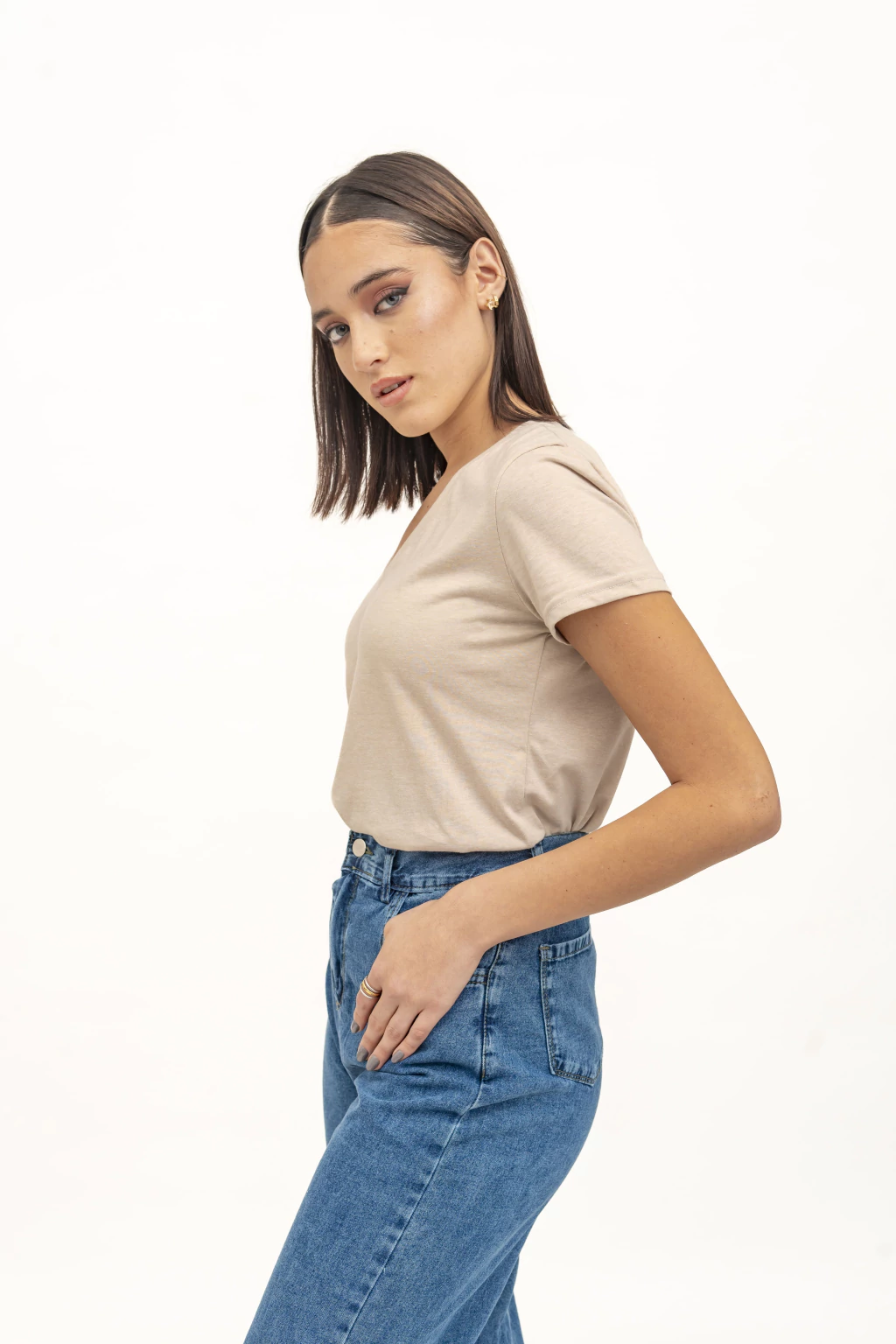 Es una prenda básica esencial con cuello en V y mangas cortas, perfecta para cualquier ocasión.